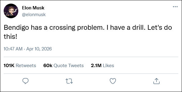 Mr Musk announced the offer on X, the social media platform he owns, writing: "Bendigo has a crossing problem. I have a drill. Let's do this."